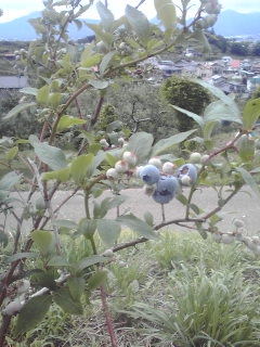 ブルーベリーの小さな木、ころんと実が大きくなってきたりんごの木。